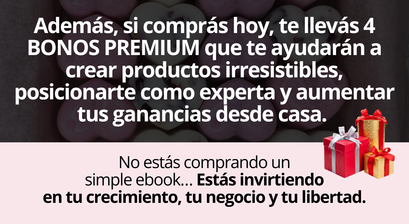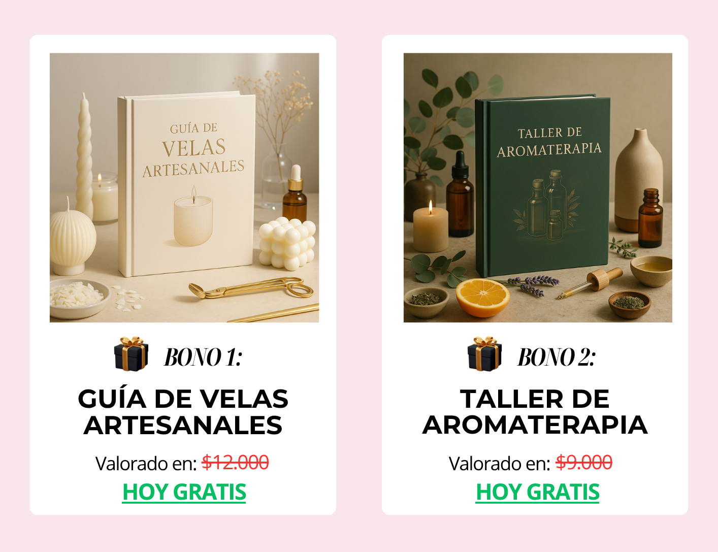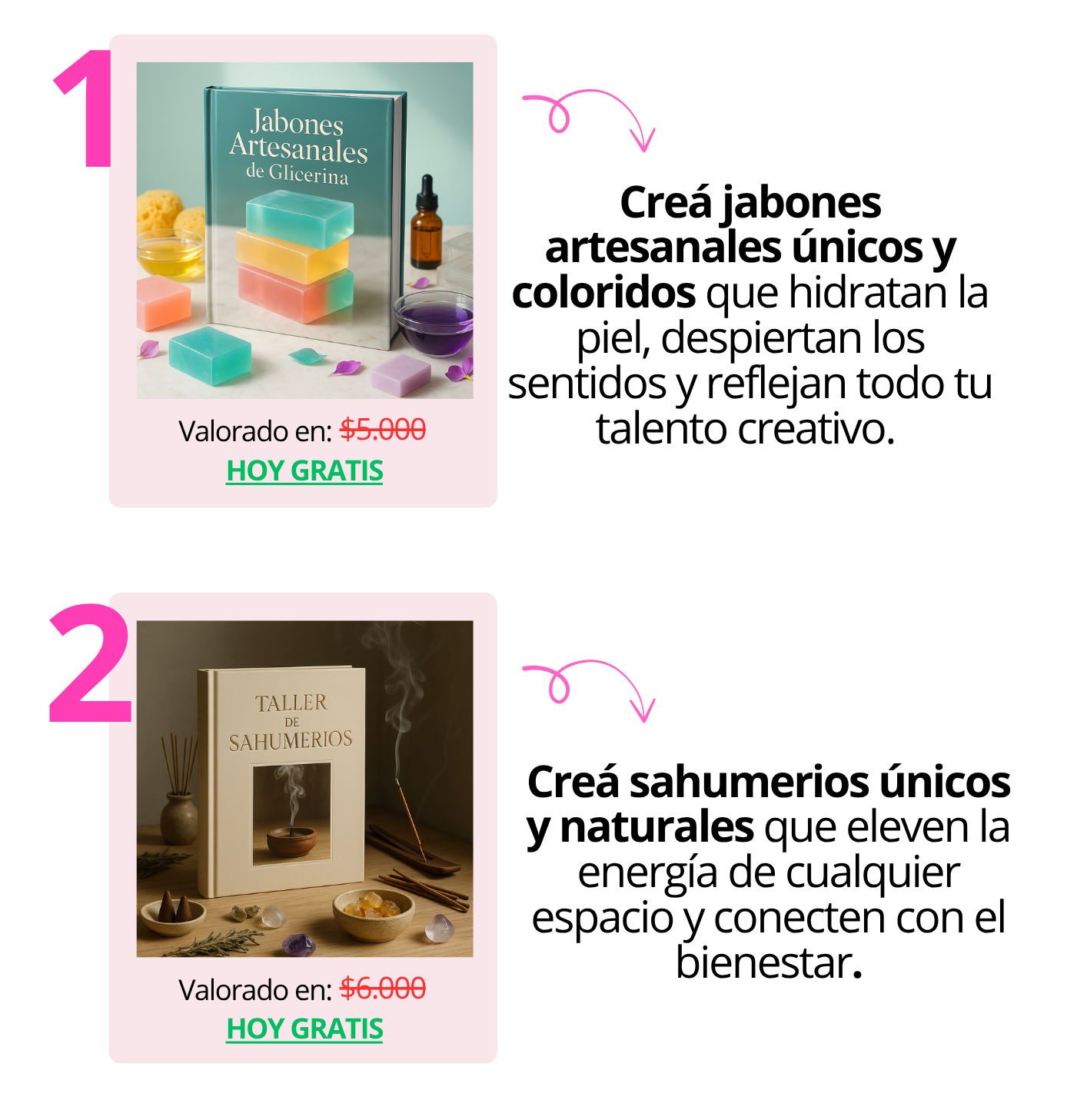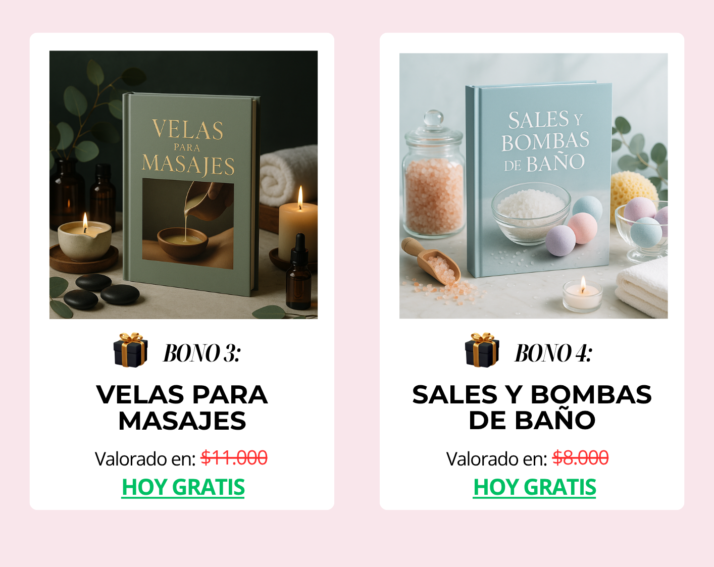 2. 🎁 4 bonos extra incluidos: guías de velas artesanales, sales y bombas de baño, jabones de glicerina, velas para masajes, aromaterapia, sahumerios y más, todo pensado para que amplíes tu línea de productos y vendas más.